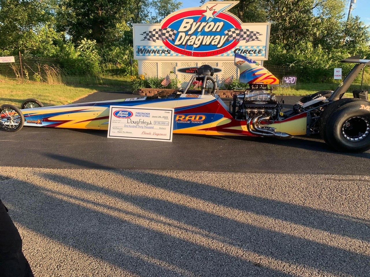 Doug Foley Jr was on a tarrrreee this past weekend in Byron, Illinois. Runner up on Friday and won Sat/Sun Combo race driving Chris's dragster. 4.20 was for fun, but she was stuck on a 4.52