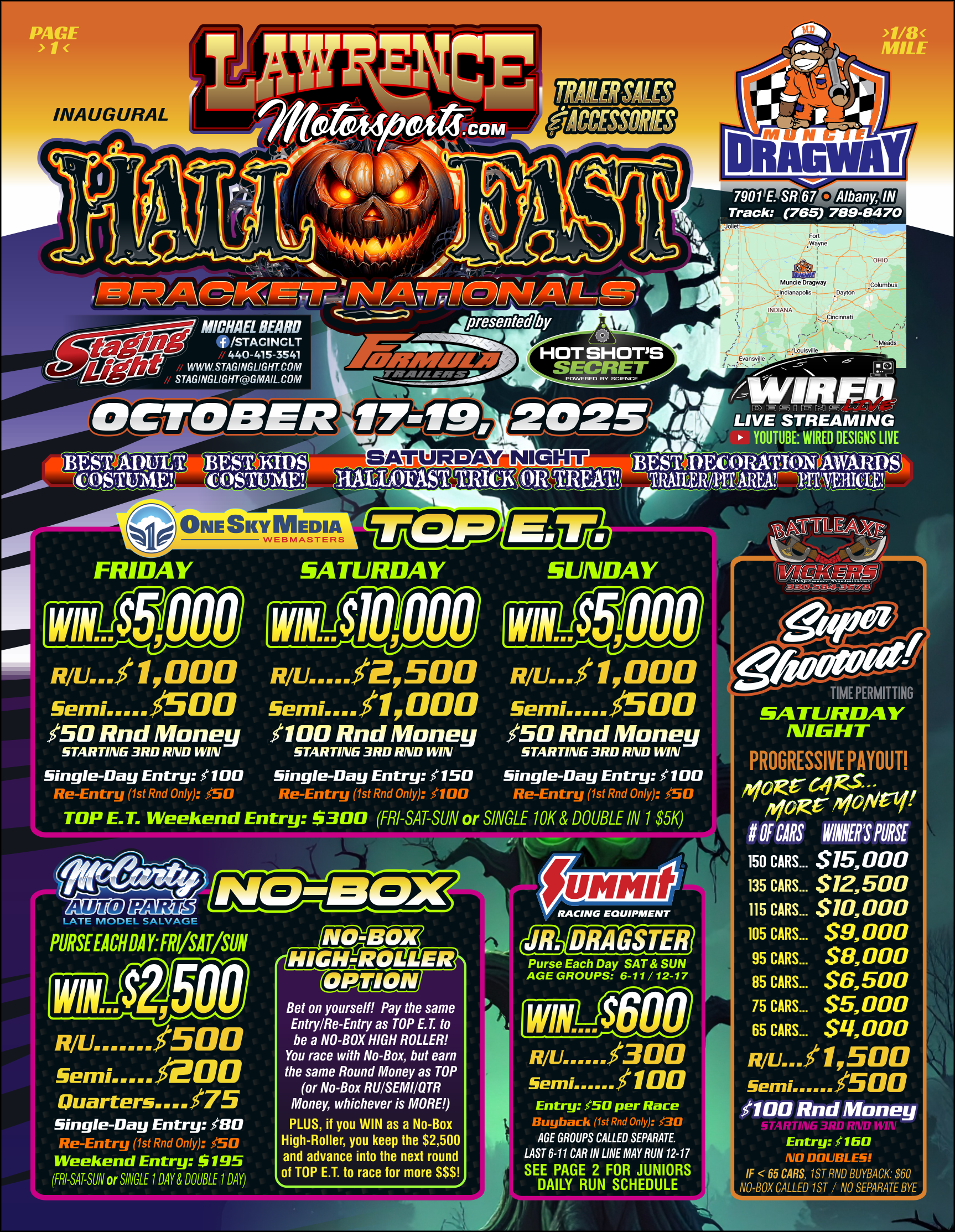 Feel that change in the air? Fall is just around the corner, and the cool go-fast weather is coming! Staging Light Events is proud to partner with Muncie Dragway in Albany, Indiana (who just hosted the IHRA Div. 5 Bracket Finals) to bring you the Inaugural Lawrence Motorsports Auto & Trailer Sales HALLOFAST Bracket Nationals, presented by Formula Trailers and Hot Shot's Secret. It's a mix of Halloween fun AND big money bracket racing. Mark your calendars for October 17-19, 2025, and tell your friends! ![]() ![]() __ Michael Beard - staginglight@gmail.com Staging Light Graphic Design, Printing & Event Marketing | ||